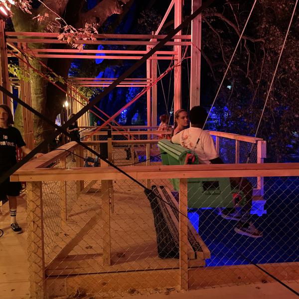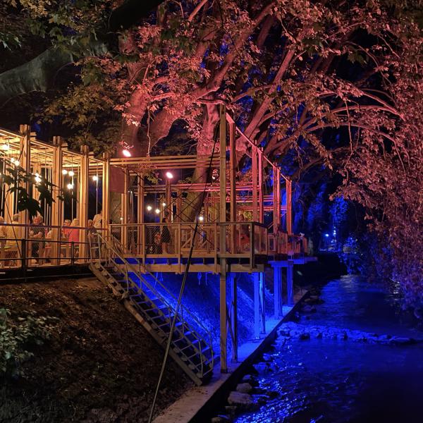 Eingebettet in die phantastischen Baumkathedralen unter den ausladenden Platanen an der Limmatpromenade zwischen der Kronengasse und dem rostigen Steg laden wir zum Schaukeln am und über dem Wasser ein. Unsere Zweierschaukeln haben in der Mitte einen Korb für kulinarische Freuden.